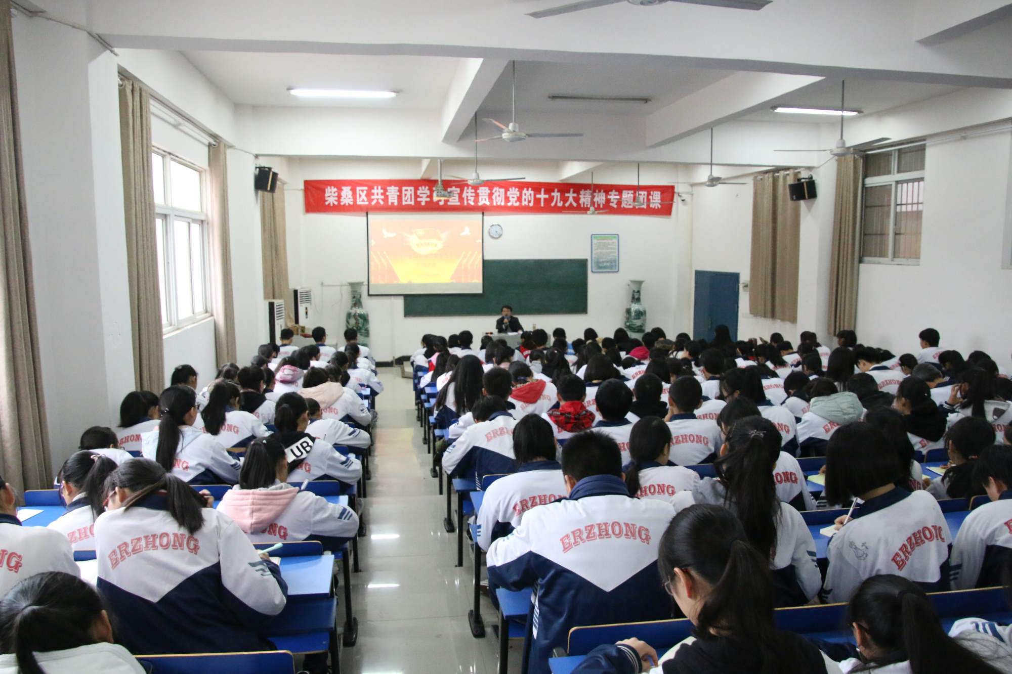 2017年11月20日下午,共青团柴桑区委书记陈石宝同志来柴桑区二中开展柴桑区共青团“学习宣传贯彻党的十九大精神”专题团课,我校校长吕敦科、副校长赵青、校团委老师及全体团支部书记和优秀团员代表共同参加学习。