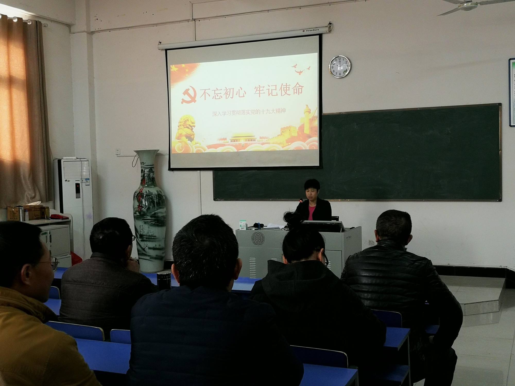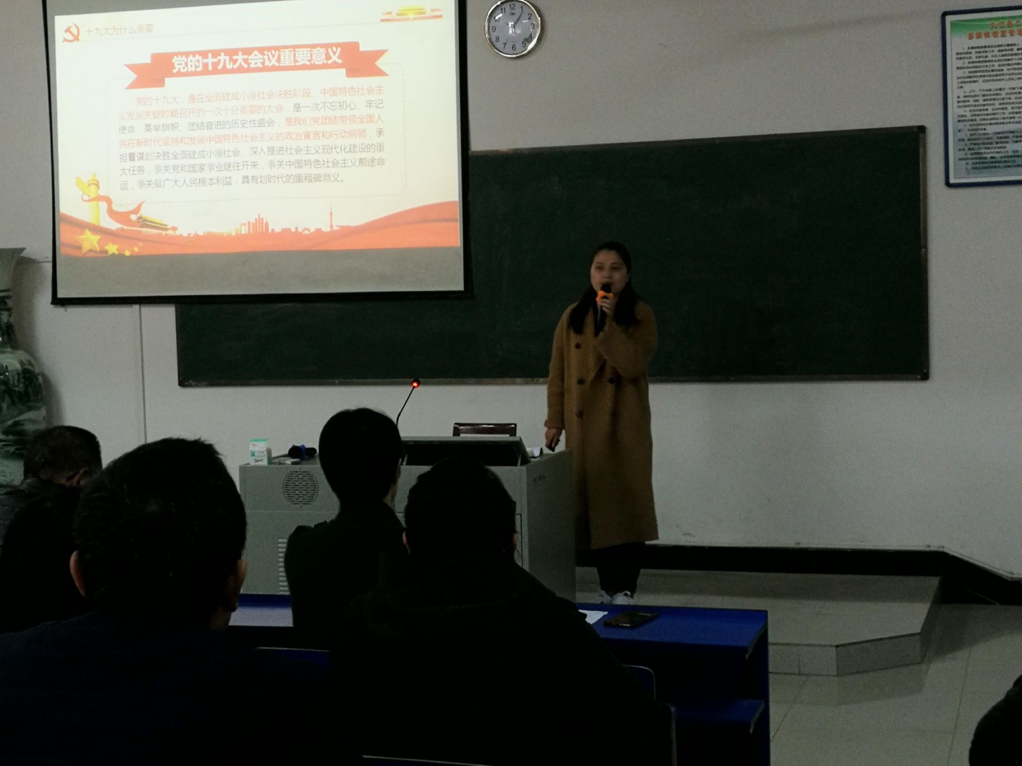 熊婷老师,从“十九大为什么重要?”“十九大报告中什么最重要?”“如何学习贯彻十九大精神?”三个角度,深入浅出的向柴桑区二中全体教职工传达了当代中国的时代最强音。