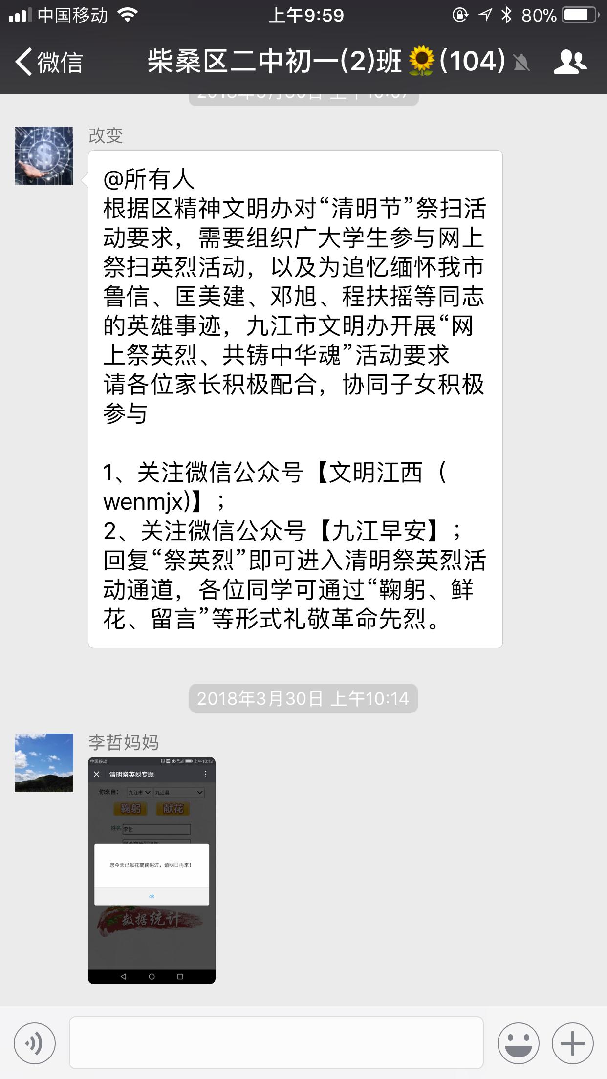 清明前后,区二中团委还组织了全校学生和家长同步开展网上以及通过微信公众号祭英烈活动,通过“鞠躬、献花、评语”等形式表达对先烈的缅怀及感恩之情。