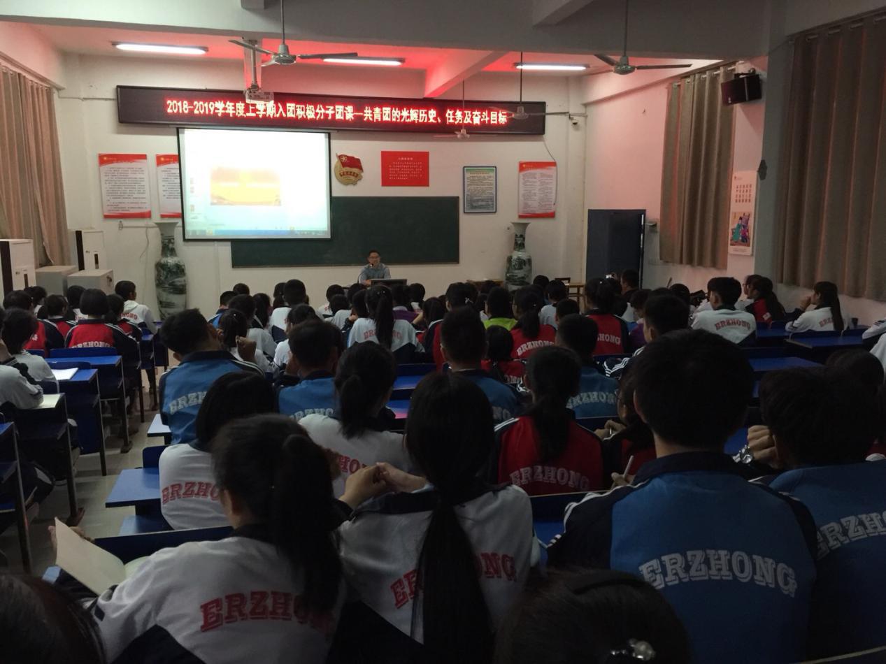 (通讯员 桂红红)为全面提升团员学生素质,引导团员学生健康发展,做合格共青团员,做党的忠诚接班人。10月8日下午班会课,柴桑区二中校团委组织本学期128位“入团积极分子”在“中学生团校”教室,进行了“共青团的光辉历史、任务及奋斗目标”的团课学习。邀请该校政教校长邱纪烈主讲。