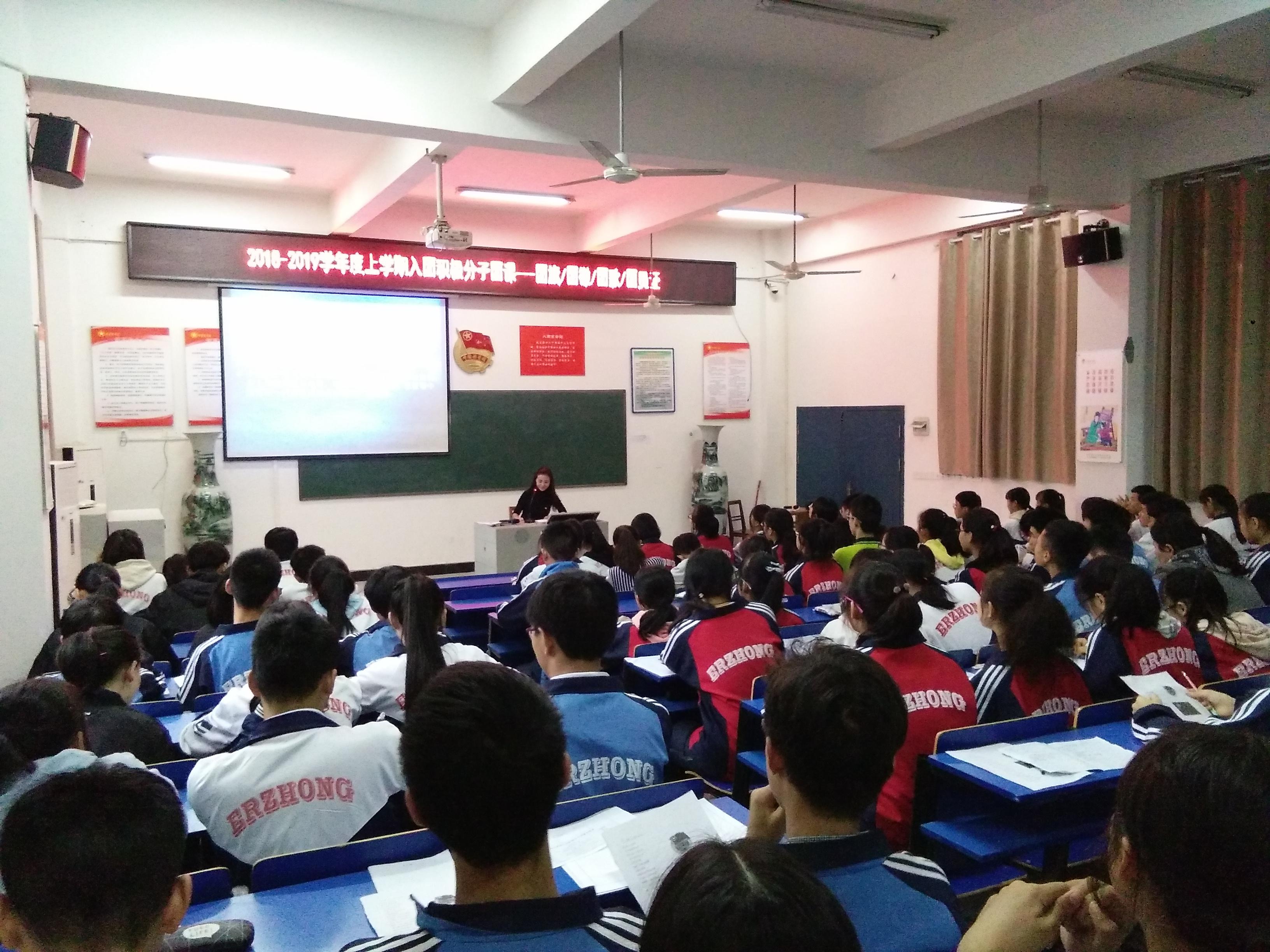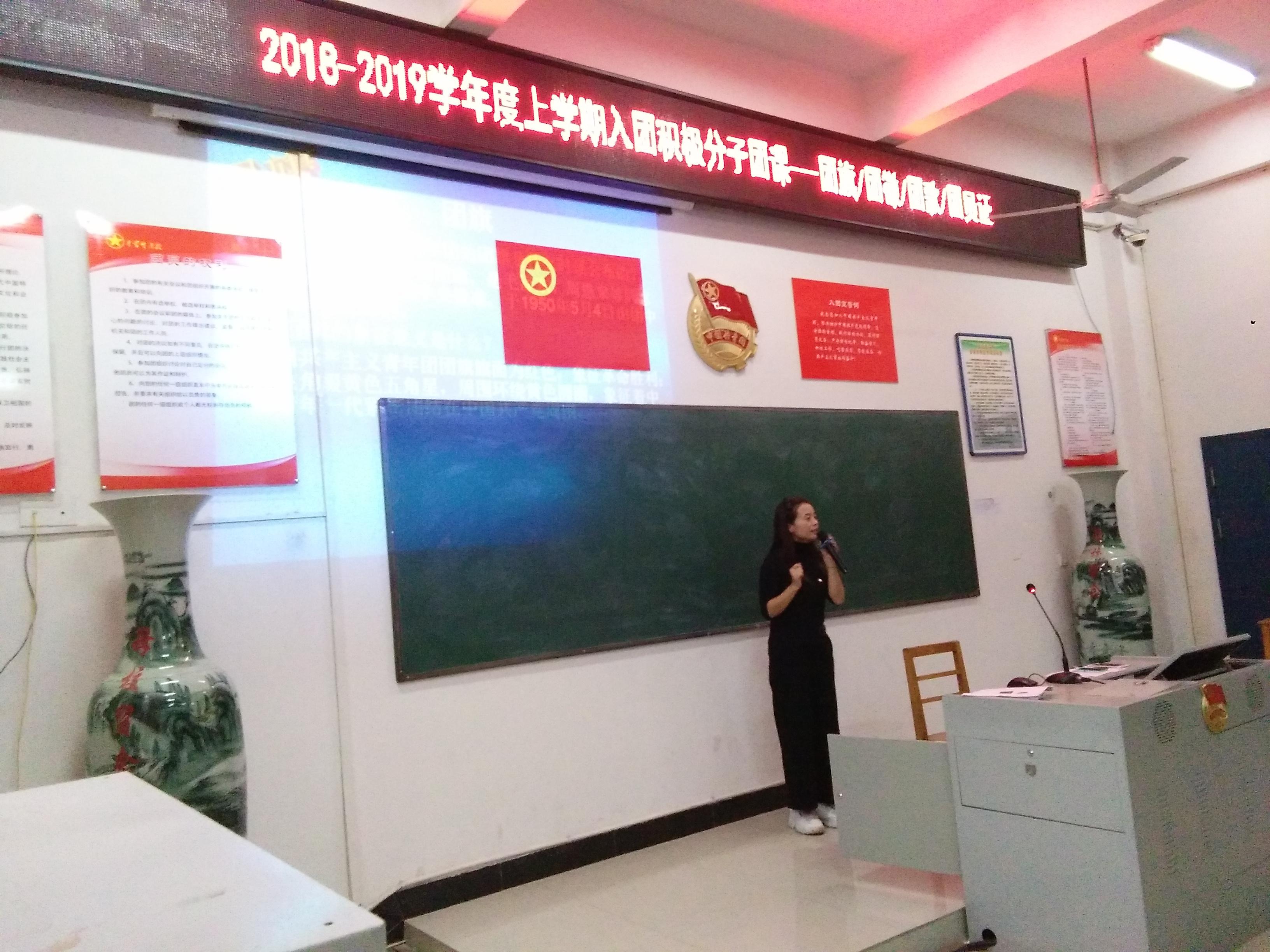 (通讯员 文先宝)为了让入团积极分子进一步了解掌握更多的团知识,增加他们的对入团的荣誉感,10月15日下午第三节课,校团委按计划在多媒体教室举行了第三次团课培训,学校团委文先保老师主持,由桂红红老师主讲了题为《团旗、团徽、团歌、团员证》的培训课程。