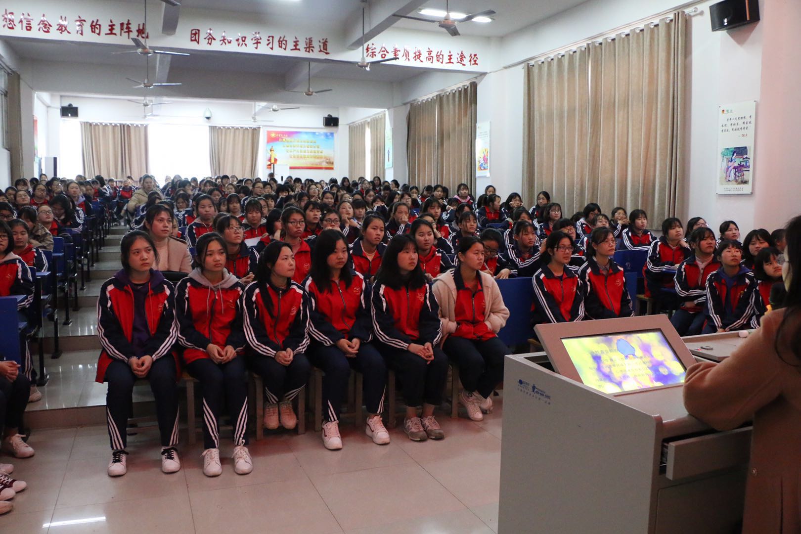 本次讲座吸引了高一年级300多名女生参加,由柴桑区妇幼保健院谢红芳医生担任主讲,谢医生从青春期的身心特点、心理健康、异性交往等方面和同学们交流了看法。希望同学们能正确看待青春期,认识青春期,学会保护自己。讲座之后,不少同学还主动留下来向谢医生请教,现场气氛活跃。