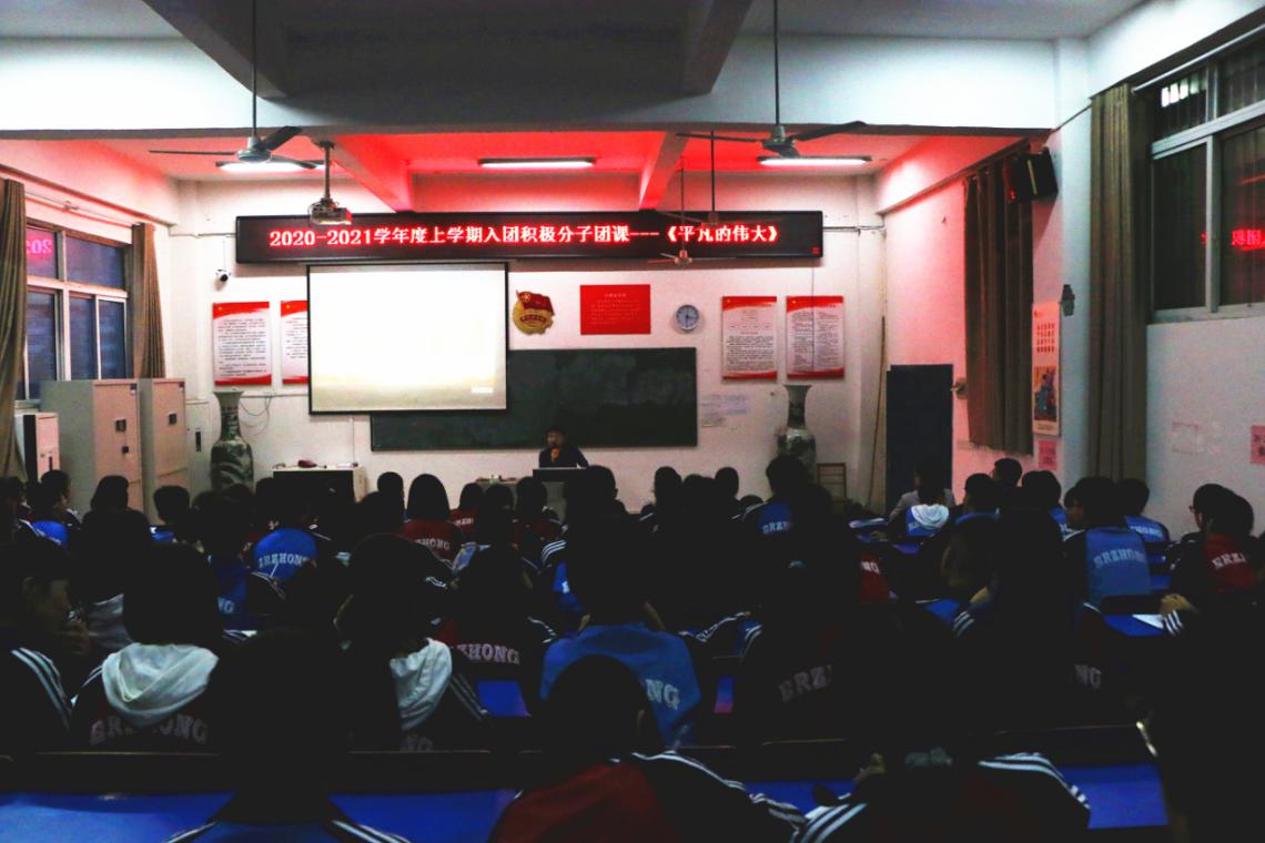 (通讯员:帅芳芳)9月21日晚上6点,柴桑区二中迎国庆系列活动之主题团课——平凡的伟大在多媒体教室如期举行。由中学生团校团课指导员,九江市骨干教师,九江市优秀青年彭志军老师担任主讲嘉宾。本学期所有入团积极分子百余人参加。