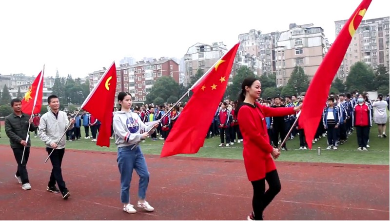 国旗下的演讲后,四位青年教师分别手持党旗、国旗、团旗、队旗,为学生们送上最真挚的寄语,将手中的旗帜郑重地交到学生们的手中。四面旗帜在台上共同挥舞,无不触动着在场每一个人的心弦,无不承载每一位共产党员、共青团员和少先队员的追求和梦想。最后,此次活动在大家嘹亮的团歌声中圆满结束。