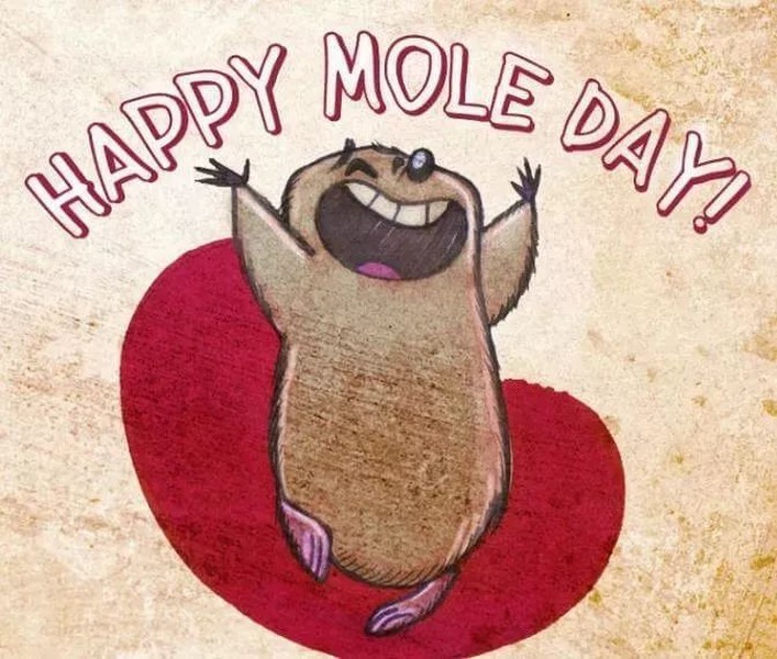 摩尔日,通常在10月23日的上午6:02到下午6:02之间庆祝。在美式写法中,这两个时刻被记为6:02 10/23,恰似阿伏伽德罗常数。又因为Mole另一个含义是鼹鼠,所以大家常常会心照不宣的发一张鼹鼠的漫画。