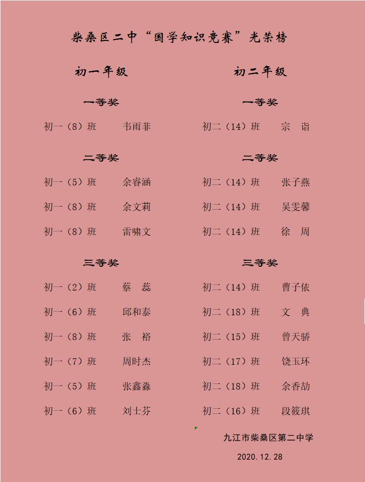 (通讯员 彭志军)近日,柴桑区二中校园文化艺术节各项活动陆续开展,由初中语文组组织开展的校园首届“国学知识竞赛”如期举行,初一、初二年级百余名优秀学生共同参与了决赛选拔活动,最终来自初一(8)班的韦雨菲、初二(14)班的宗诣分别拿下所在年级国学知识竞赛的第一名。