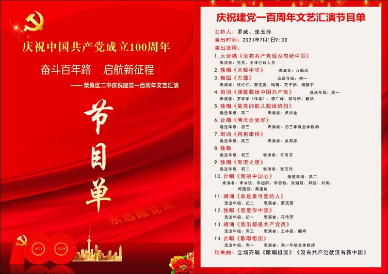 百年征程波澜壮阔,百年初心历久弥坚。为隆重庆祝中国共产党成立100周年,回望百年历史,追忆奋斗历程中的革命先辈事迹,7月1日上午,九江市柴桑区第二中学庆祝中国共产党成立100周年文艺汇演在校新会议中心举行,全体教职工一起观看演出。