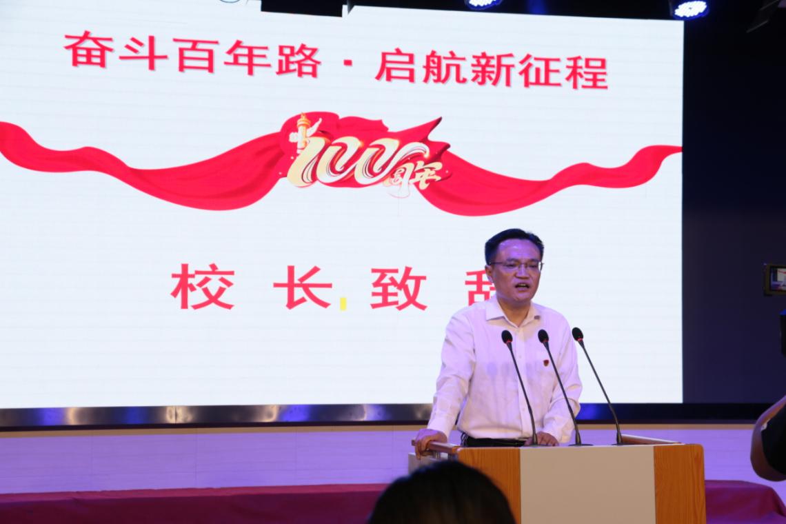 宣誓结束后,校长朱巨军致辞,他首先讲述了中国共产党百年来领导中国人民实现从站起来、富起来到强起来的伟大历史飞跃,表达了对共产党的无限热爱,并勉励所有的教职工要听党话、感党恩、跟党走。同时他代表学校向一直以来辛勤工作的同仁表示衷心感谢,特别是毕业班的老师们,2021年柴桑区二中高考成绩再次创造历史,书写传奇,优异的成绩是为庆祝建党100周年献上的一份厚礼。