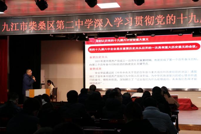 柴桑区二中文科支部书记叶珍勇主任作了《凝聚思想共识 激发奋进力量》的主题报告,报告分别从深刻认识党的十九届六中全会重大意义、深刻认识党的十九届六中全会重要成果、深刻认识党的十九届六中全会核心要义、在新时代新征程上赢得更加伟大的胜利和荣光等四个方面深入学习了党的十九届六中全会精神。