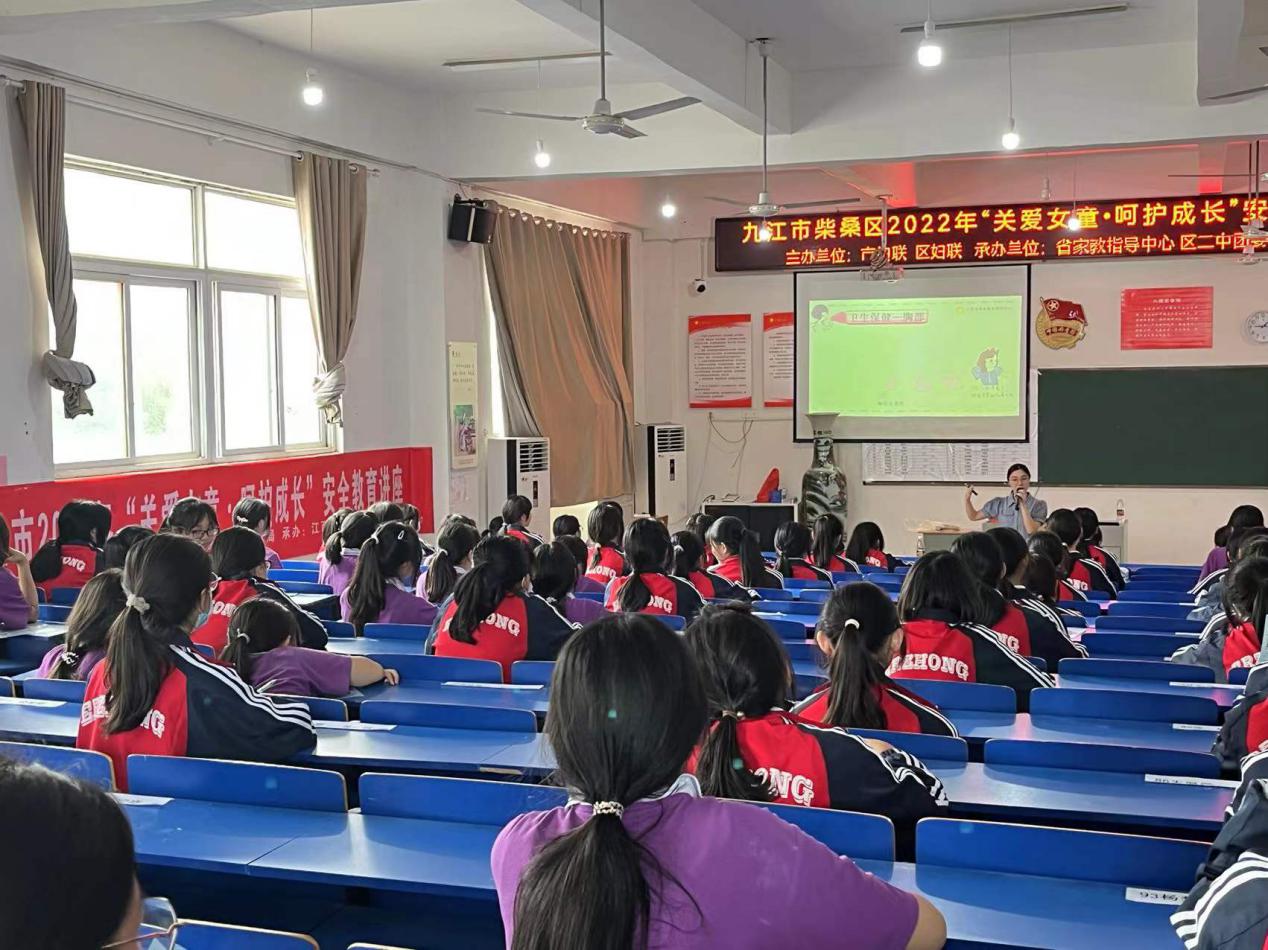 (通讯员 王莹)6月22日上午, 柴桑区妇联联合区二中团委组织初一、初二年级女生参加“关爱女童•呵护成长”安全教育讲座。