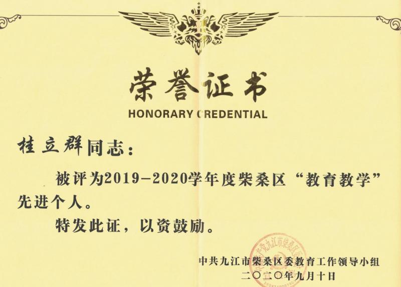 《孟子》曾言:“以其昭昭使人昭昭”。是的,就教书而言,要想给人一碗水,自己必须有一桶水。为了上好每一节课,我积极参加各种专业培训,力争将知识高效地传授给学生。我还积极地参加各种教学类竞赛,曾获得九江市班主任安全课说课大赛高中组一等奖,并代表九江市参加省级比赛;获得过各类论文评比、录像课大赛、基本功大赛等省级、市级一等奖、二等奖,区级特等奖等等;多次指导学生参加各类听力、写作大赛,均获得省级、市级一等奖的好成绩。每年都被评为学校的“优秀教师”“师德标兵”,更获得柴桑区“优秀班主任”“教育教学先进个人”“骨干教师”等荣誉称号。