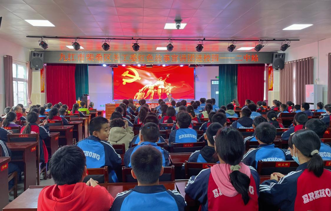 (通讯员黄虹 李冰钰)10月28日上午,柴桑区关工委联合柴桑区第二中学团委组织开展了“红色故事宣讲团进校园”主题宣讲活动。关工委熊家海老师担任主讲人。