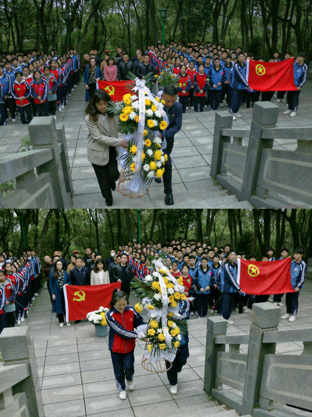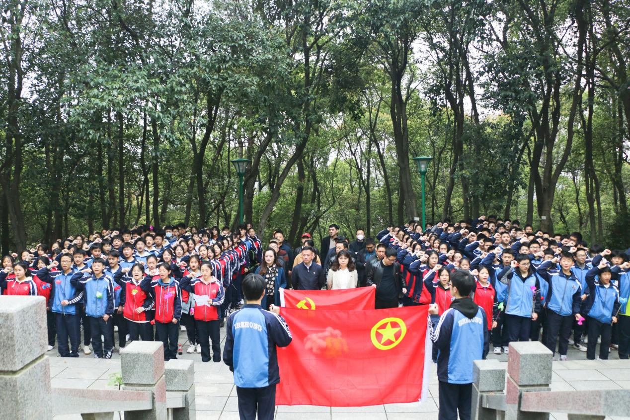 在革命烈士纪念碑前,全体师生肃立默哀,向烈士敬献花篮,并以庄重的注目礼向烈士致以崇高的敬意,向革命烈士寄予深深的哀思,党员重温入党誓词,牢记初心使命,赓续红色传统;共青团员重温入团誓词,铭记团员使命,不忘入团初心。