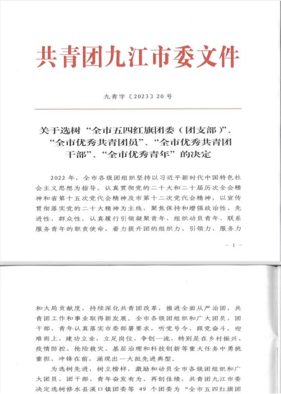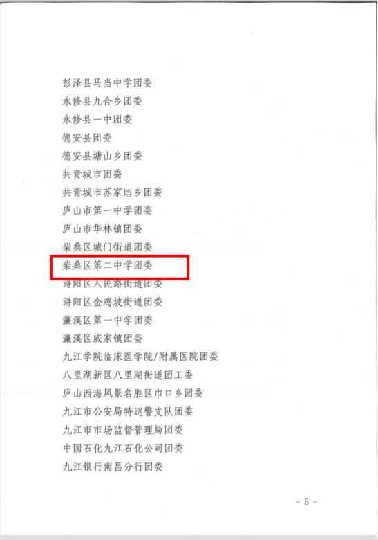 在纪念“五四运动”104周年之际,共青团九江市委表彰了一批在全市共青团工作中表现突出的组织和个人,柴桑区第二中学团委被授予2022年度“全市五四红旗团委”称号。
