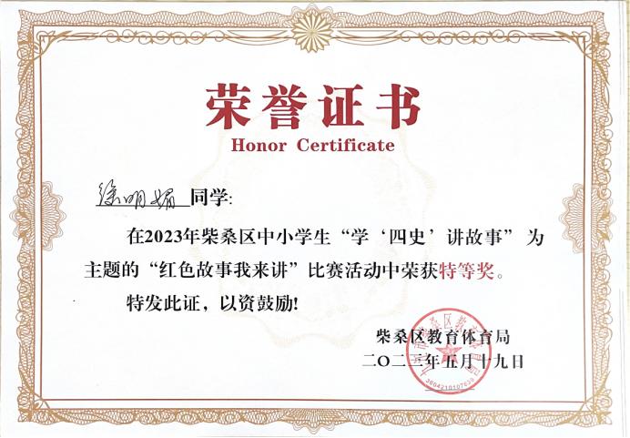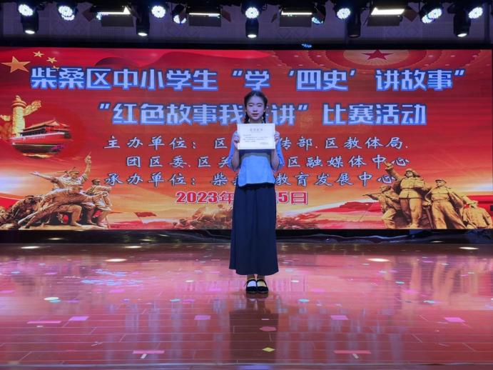 5月19日上午,柴桑区中小学生“学‘四史’讲故事”——“红色故事我来讲”活动在区教育发展中心举行,柴桑区二中初一(6)班徐明媚同学代表学校参赛,荣获特等奖。