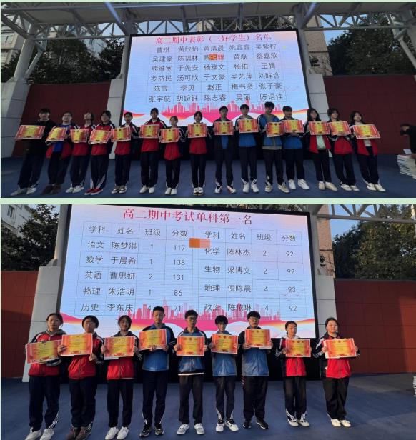 大会表彰了本学期的三好学生,期中考试单科第一以及考试中取得优秀成绩的学生。熊婷和刘昌辉为获奖同学们颁发奖状及奖品。