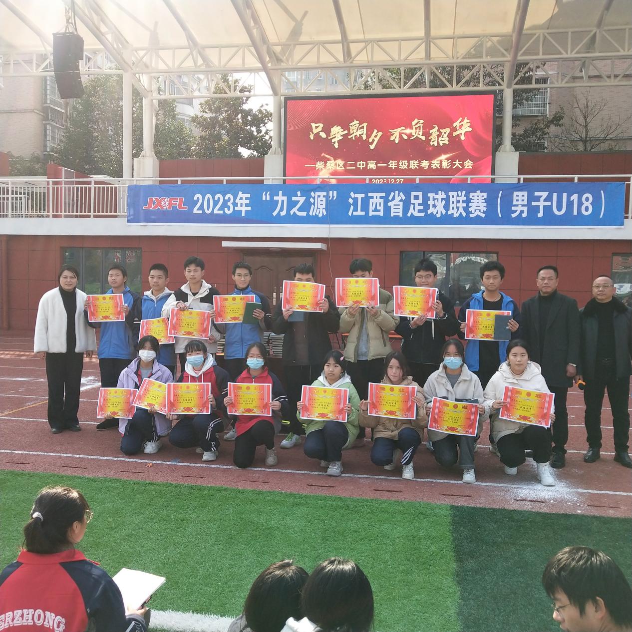 (通讯员 李广峰)12月27日中午,阳光明媚,绿草如茵。柴桑区二中高一年级全体学生齐聚校运动场,举行了省联考表彰大会。校党委书记雷新江、校长熊婷、副校长熊进、年级主任熊修江、团委书记桂红红等校领导出席了大会。