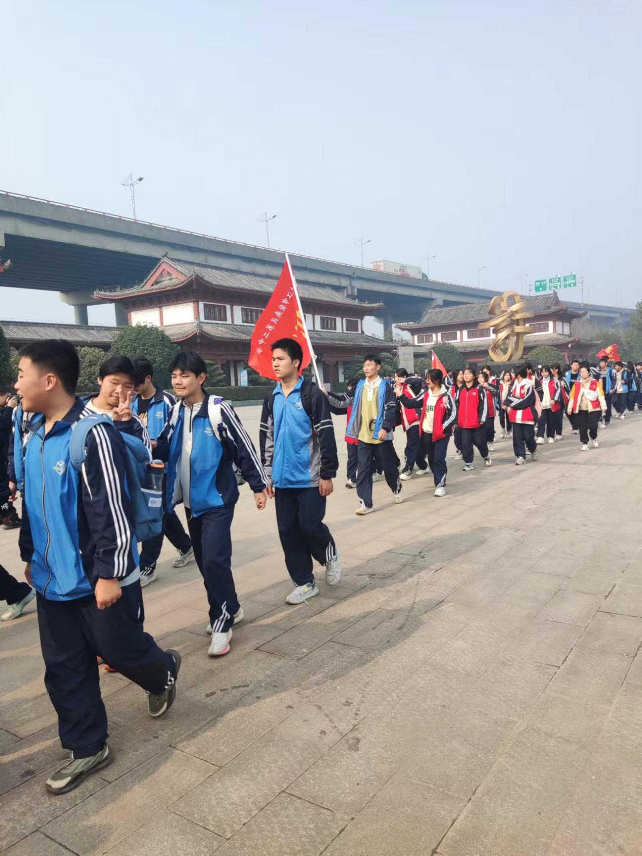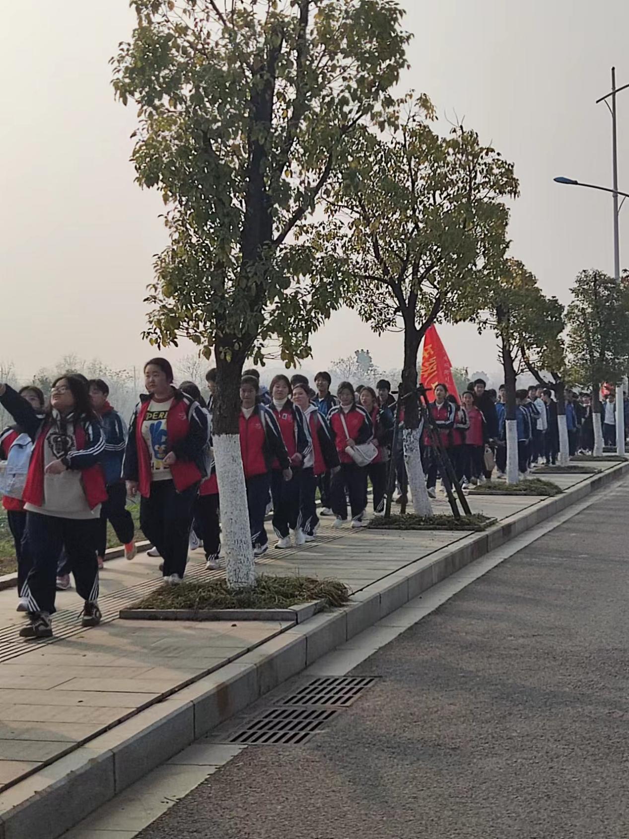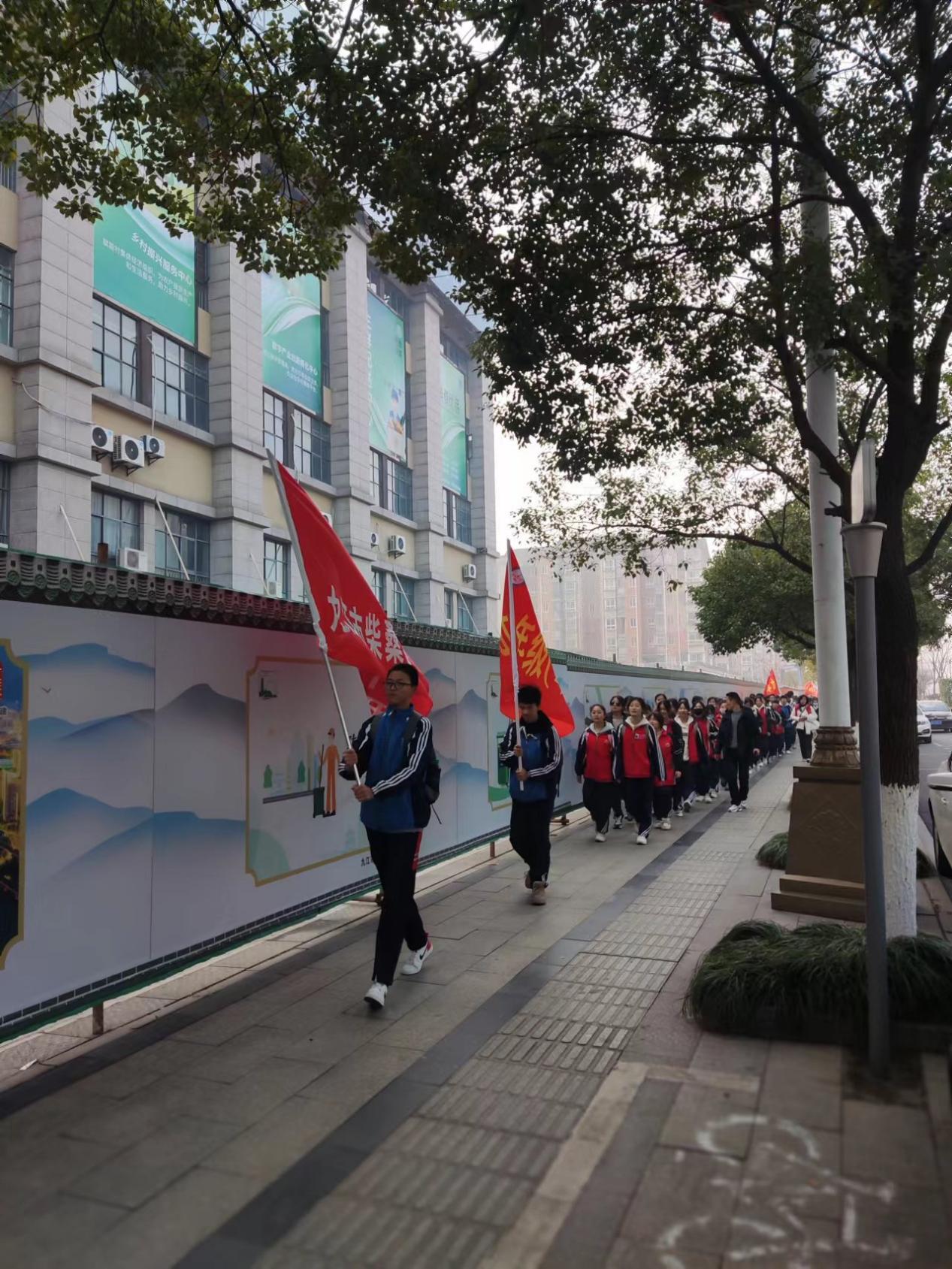 一路上,旗帜迎风飘扬,欢声笑语,时而歌声一片,时而口号嘹亮,此起彼伏,无不彰显学子们青春的蓬勃与朝气。飘扬的旗帜、欢快的歌声、响亮的口号,成为征程途中一道亮丽的风景。