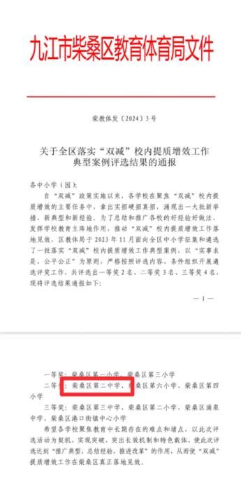 在“双减”背景下,柴桑区二中积极探索实践,总结“双减”经验。近日,在全区落实“双减”校内提质增效工作典型案例评选活动中,柴桑区二中“双减”典型案例喜获二等奖。