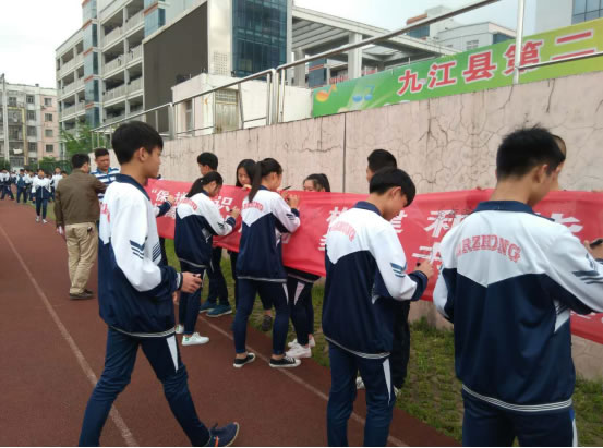 高一年级500余学生在教务处张顶主任和高一年级主任邱纪烈的带领下,和县文化局执法大队成员一道,共同参与未成年人健康阅读“绿书签2017”进校园签名仪式。